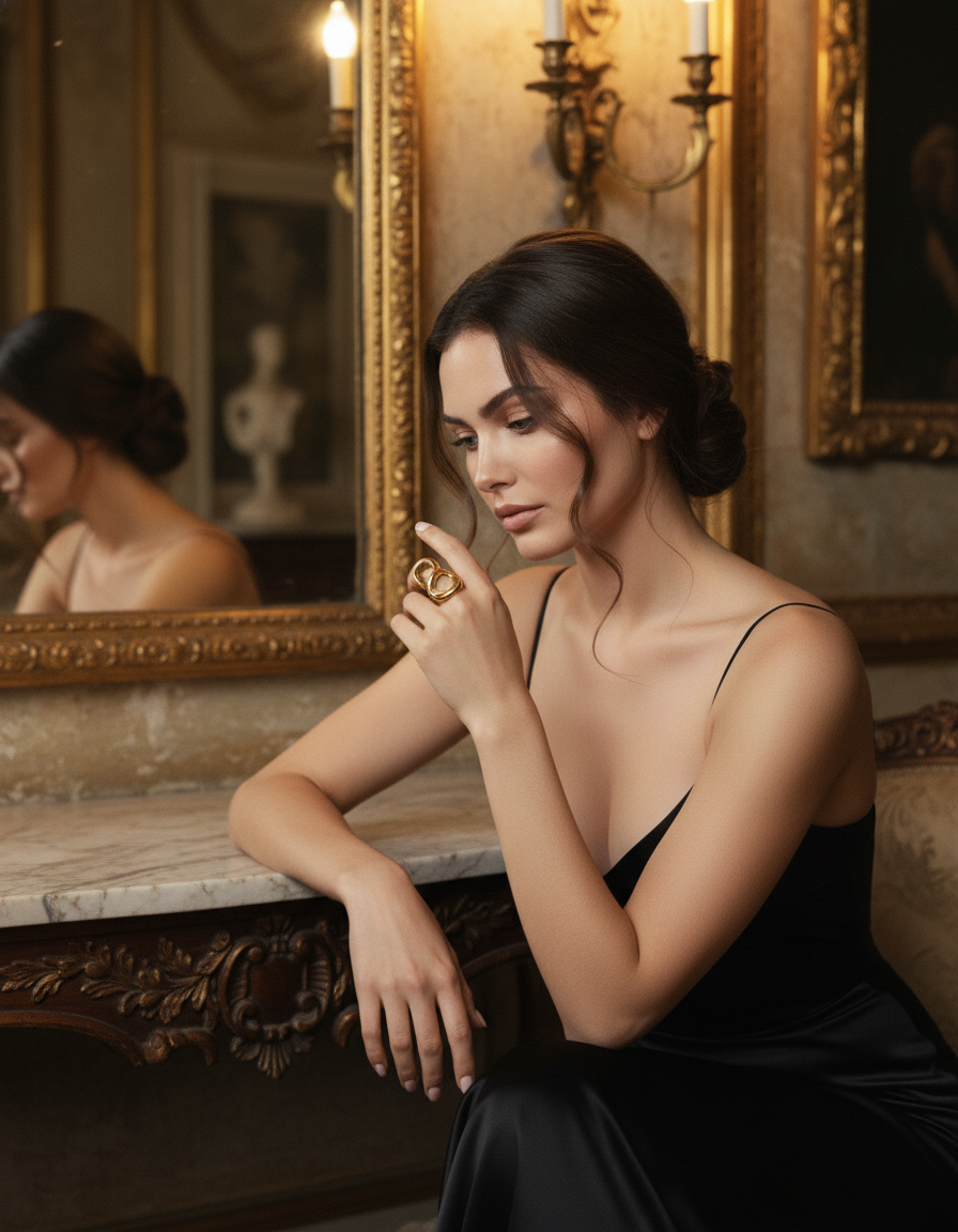 Cada gesto —la mano que roza el canal, la mirada perdida en el reflejo, el oro que brilla sin intención— construye una historia donde el silencio se convierte en presencia.