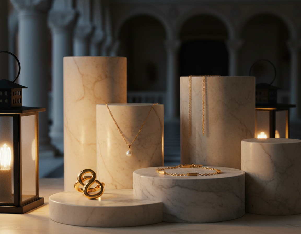 Cada pieza se convierte en un punto de luz dentro de la penumbra, dialogando con el entorno: el mármol frío, las farolas encendidas, el agua que refleja sin distorsionar.