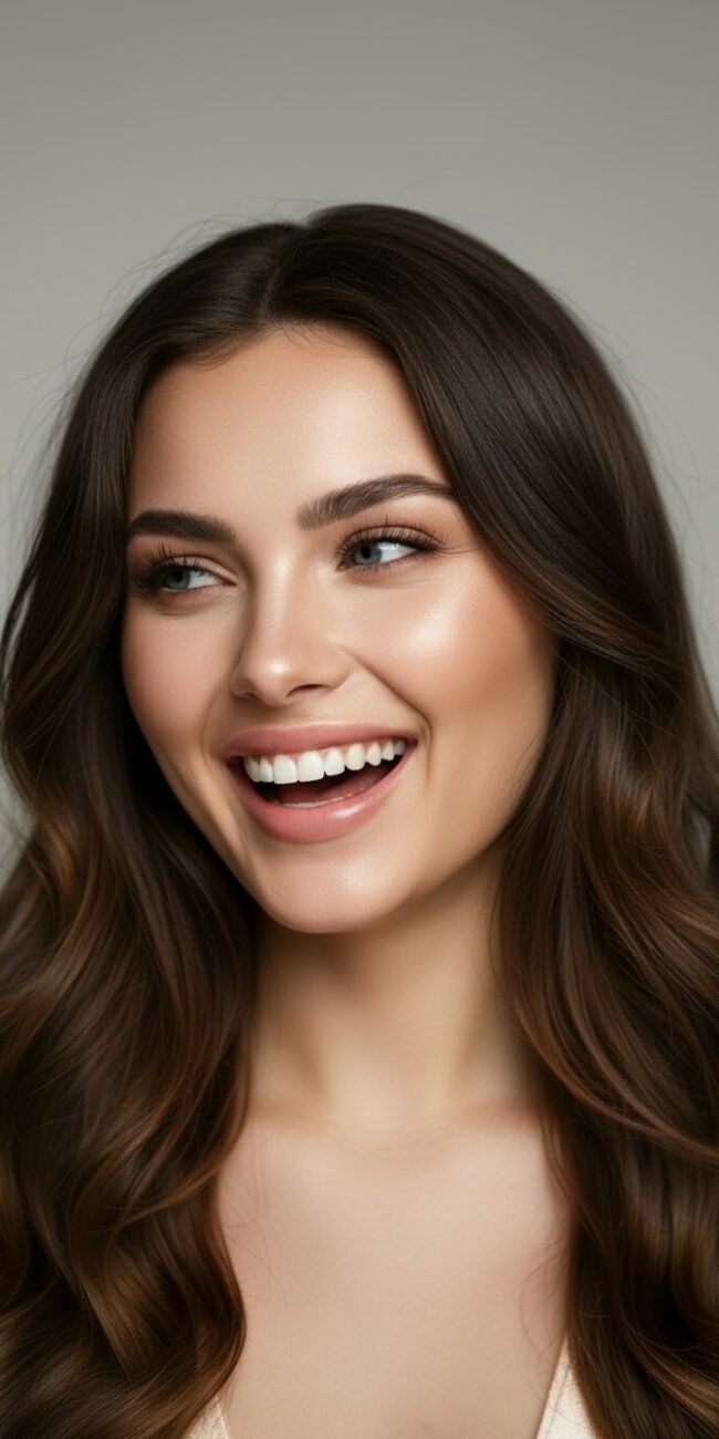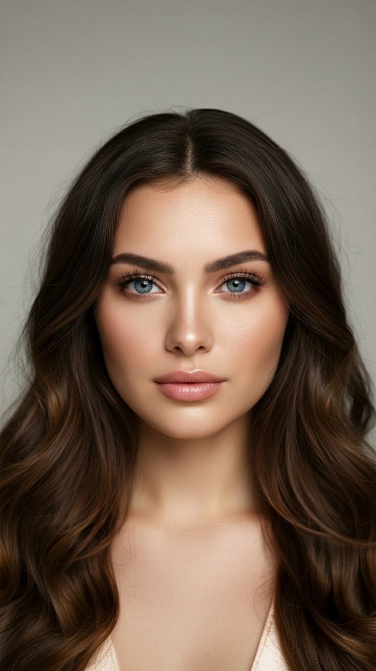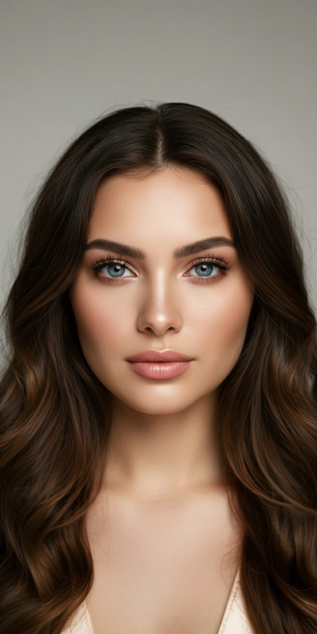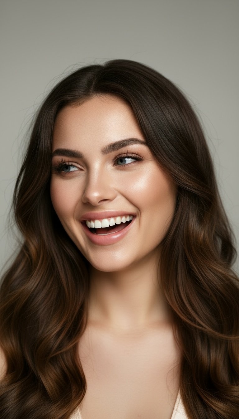 Castaño oscuro con reflejos dorados, largo y ondulado